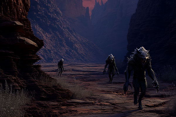 The lands that cling to the edge of the Torn are barren of life, seared clean by its eternal heat. The earth there is a wasteland of jagged stone and broken ridges, its surface cracked into burnt-red sands where nothing naturally grows. Fossilised bones jut from the ground like accusations, remnants of an age devoured when the chasm first tore the world asunder. Across the Rift Plains to the south and the Witherlands to the north, twisted things prowl—beasts warped by the Torn’s corruption, their bodies reshaped into nightmares. Some walk on four legs, others on two; the Clattermaws, shrieking scavengers that chitter through the night as they hunt the unprepared, and the Gharisk, reptilian horrors with serpent skulls and barbed spears, haunt the desolation under moonlight.