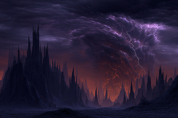Beyond this scarred heart, the land recoils as though in pain. Where the earth once lay smooth, it heaved and buckled at the Torn’s birth, rising into mountains vast and cruel. To the south, the Bluefire Mountains rear up, their peaks of icy stone veined with volcanic fire, belching smoke and snow in equal measure. To the north, the Frostspires claw at the sky, frozen monoliths of jagged stone and endless ice, cold citadels looming above the wasteland.